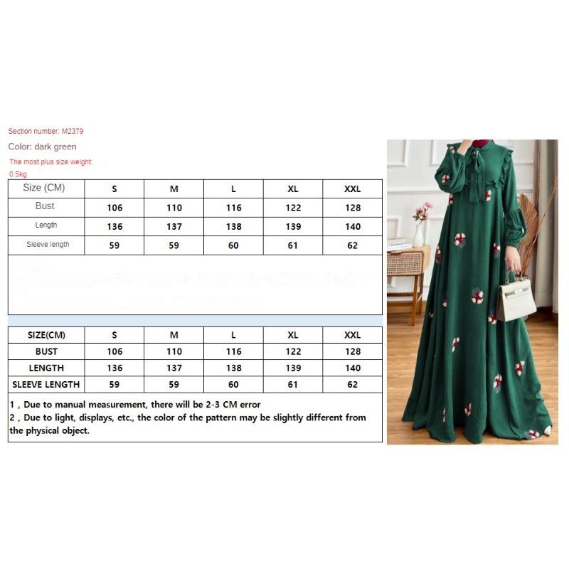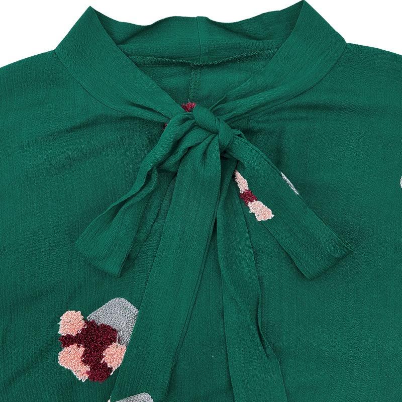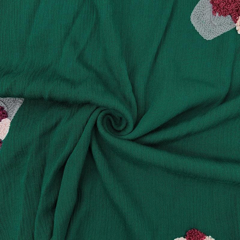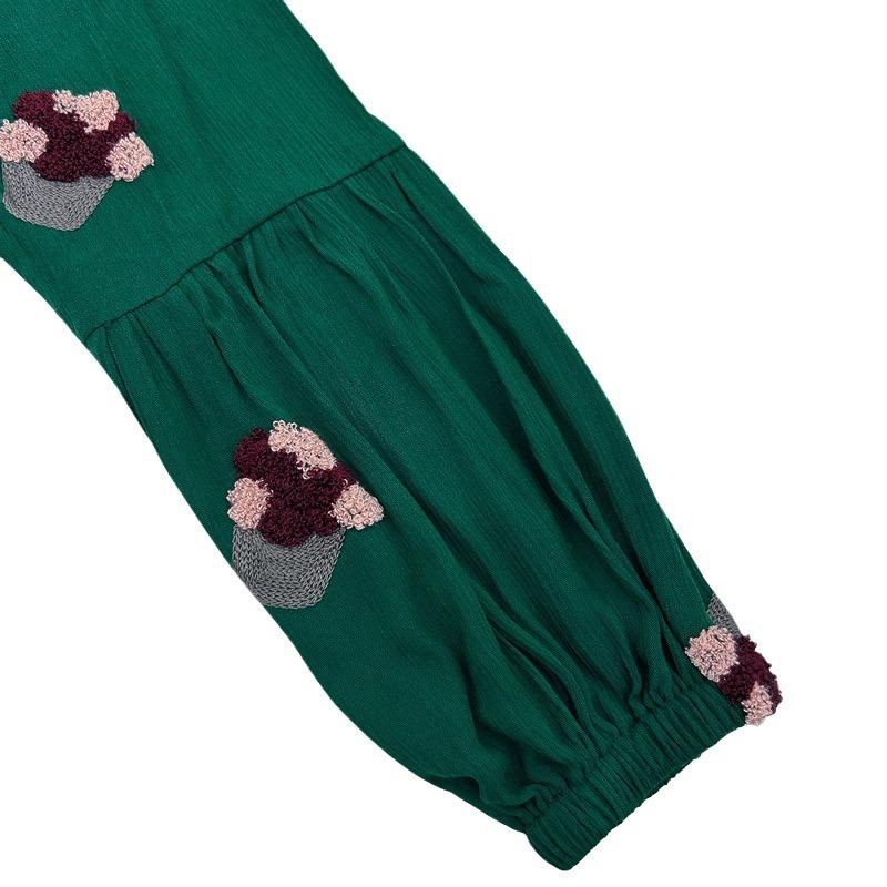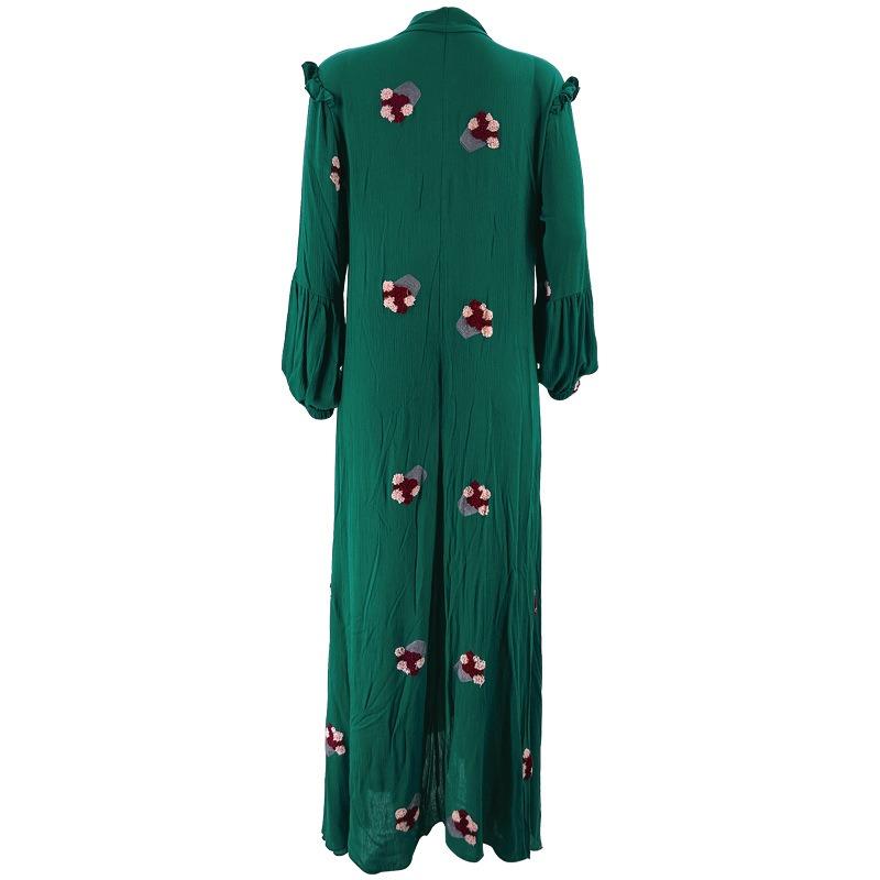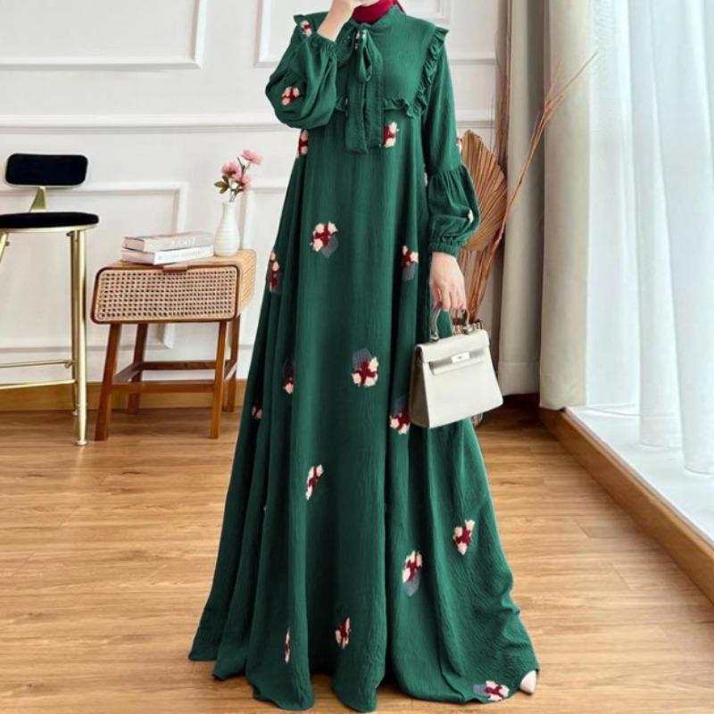 This beautiful maxi dress is in a deep green shade, featuring subtle floral embroidery scattered throughout the design. The dress has long sleeves with gathered cuffs and a tie-neck detail that adds a touch of sophistication. The loose, flowing silhouette provides comfort while maintaining a stylish, modest look. The lightweight fabric makes it perfect for a variety of occasions, whether casual or semi-formal. The overall look is elegant yet understated, ideal for women seeking both comfort and grace in their wardrobe.